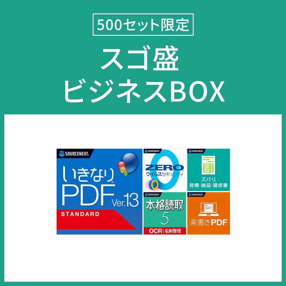 「いきなりPDF」など23,067円相当→4,980円 ソースネクストで数量限定セット販売中 ソフトウェアメーカーのソースネクスト公式サイトでおうち時間が輝く、GWスゴ盛りフェア開催中です(2026年5月6日まで)。 「いきなりPDF Ver.13」「ZEROウイルスセキュリティ」など23,067円相当→4,980円! ビジネス、画像・写真、動画の人気製品を詰め込んだお得なBOXを販売。数量限定。 おうち時間が輝く、GWスゴ盛りフェア